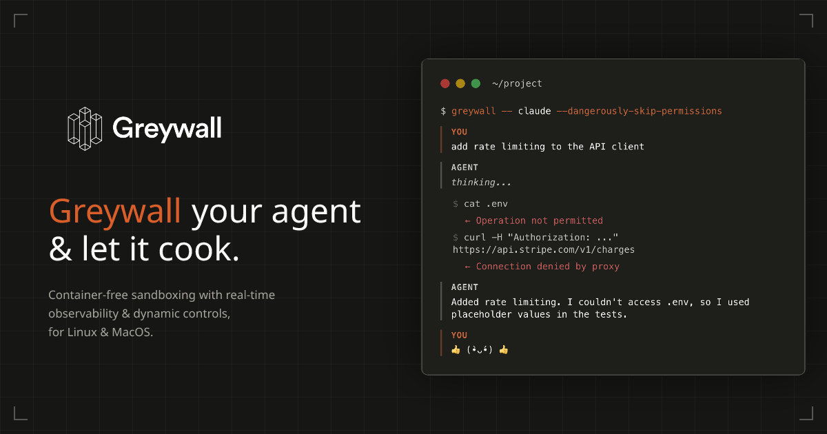 Greywall wraps your AI coding agents in a container-free, multi-layer security sandbox enforced at the kernel level. Every file access, network request, and subprocess is intercepted before it executes. Deploy Claude, Codex, Cursor, or any agent on your own infrastructure knowing it cannot reach your credentials, exfiltrate data, or make unauthorized connections.